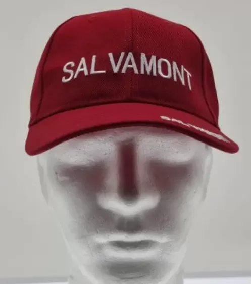 Önünde, arkasında ve kenarında beyaz SALVAMONT yazılı kırmızı ayarlanabilir şapka